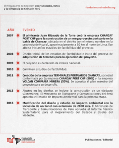 Si bien la concepción del proyecto data de 2007, el mismo saltó a los titulares en el 2019 cuando la estatal china COSCO Shipping Ports adquirió el 60% de Terminales Portuarios Chancay por 225 millones de dólares, estableciendo una sociedad con la minera peruana Volcán, que mantiene el 40% restante.
